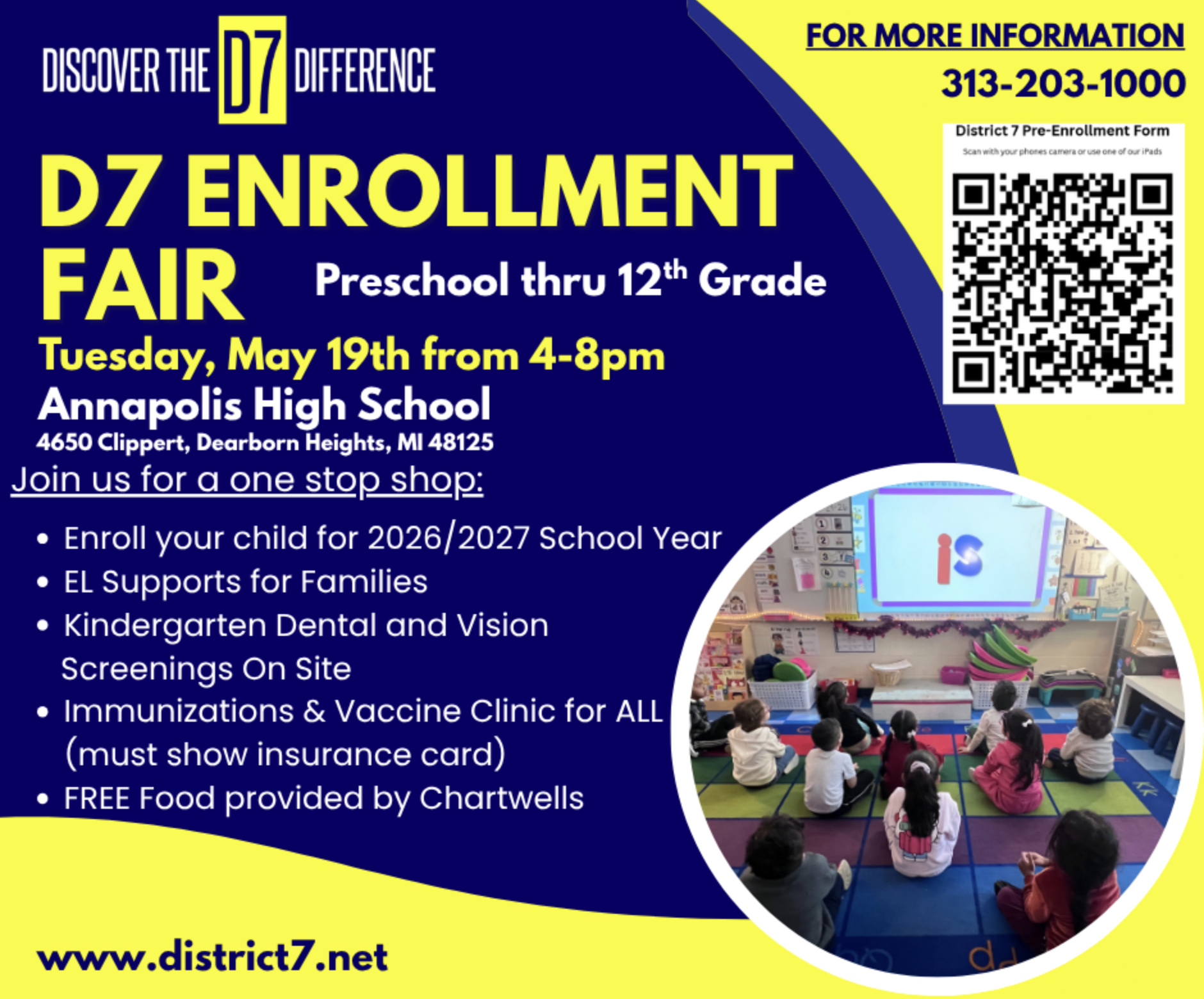 D7 is conducting an Enrollment Fair for all new incoming students. This includes our incoming Kindergarten students, School of Choice Students and new families moving into the District. The enrollment fair will assist those families as we prepare for the upcoming school year. For those families who are interested in School of Choice for the 2026-27 School Year, the application window will open May 15th. Applications are being accepted for all grade levels K-12. Please attend the enrollment fair to enroll.After May 15th, visit the District’s Web Site to enroll! Discover the D7 Difference! See flyer and QR code below: